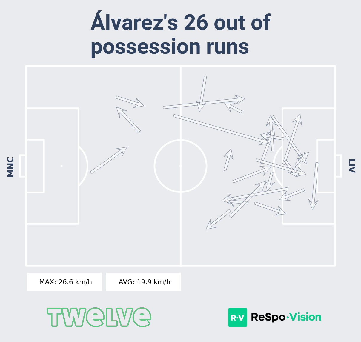 Every player runs in a different way. Starting deep in midfield, De Bruyne’s run end deep inside the opposition box. He was the target of four runs deep behind the defensive lines. Gundogan’s role is simple but important: when attacks start he runs forward making sure he is central in or just outside the box. Alvarez runs are mostly central, but it is his diagonal runs where he is targeted for passes by his teammates. Mahrez runs start a long way out on the wing but quickly arrive in the box.