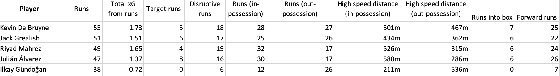 From a scouting perspective, the maps above show the types of runs players like to make. Moreover, linking the xG of the possession to the runs made allows us to rank how involved they are creating to chances. We use xG to measure intelligent running, not just the total number of runs. Below we rank five City players in that match.