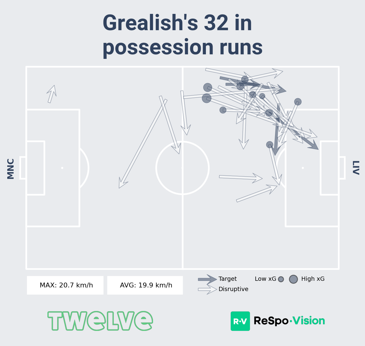 Shaded arrows show when Grealish accelerated and received the ball. Unshaded is where he makes a run and doesn’t receive. The size of the circle indicates the expected goal value created in the possession that contained the run. 10 out of 32 of Grealish runs resulted in a high xG chance, although only one of them (an assist in the first goal saw the ball passed to him). By running off the ball he opened up space for his teammates.